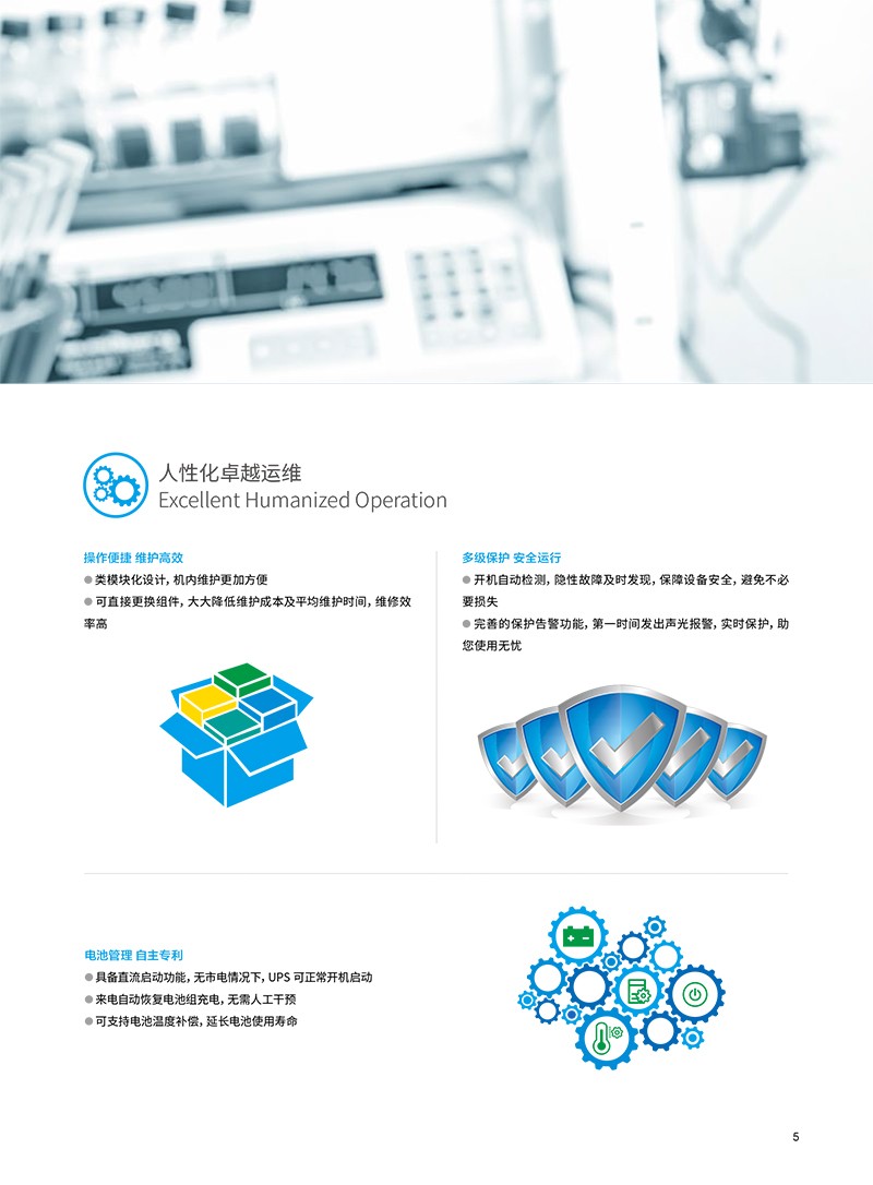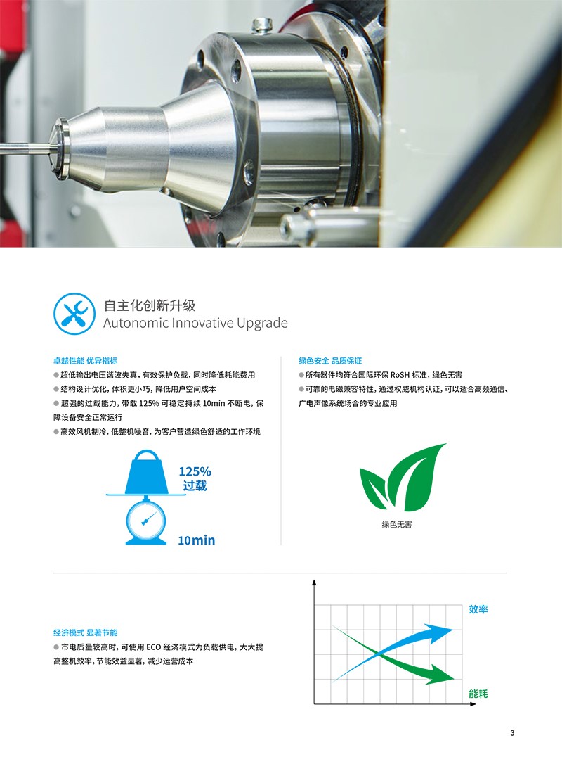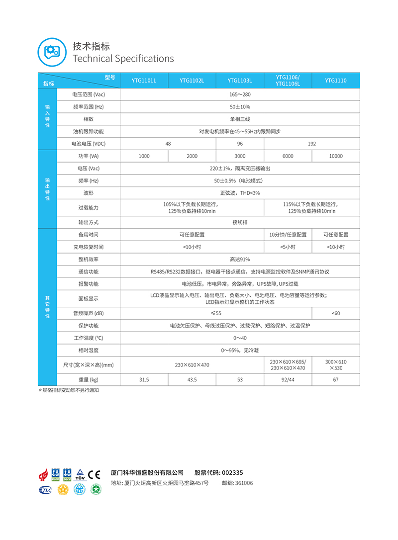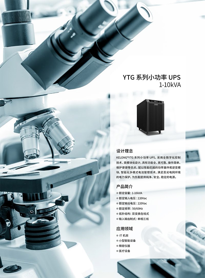 概述 科华UPS电源YTG系列小功率UPS(1-10kVA),采用全数字化控制技术、类模块化设计,具有功能全、高可靠、操作简单、维护便捷等优点,配以性能优越的功率器件和逆变模块、智能化多模式电池管理技术,满足恶劣电网环境的电力保护,为负载提供纯净、安全、稳定的电源。 功能特点 ●数字控制,超强适应 先进的DSP+MCU 控制,数据处理精确迅速,精度高、实时性强 具备快速的故障自我诊断和处理能力,自我保护功能完善,可靠性更高 输入具有防雷浪涌设计,可在特殊条件下有效的保护设备 超强的电源输入适应性,电网适应能力强,轻松应对恶劣用电环境,避免频繁市电/ 电池切换,延长蓄电池工作寿命 输出隔离变压器,具有极强的抗冲击、抗短路特性,为用户关键负载提供最大限度的保护 强化的组合结构机柜,可适用于各种恶劣工业环境 ●优异指标,绿色安全 超低输出电压谐波失真,有效保护负载,同时降低耗能费用 超强的过载能力,带载125% 可稳定持续10min 不断电,保障设备安全正常运行 高效风机制冷,低整机噪音,为客户营造绿色舒适的工作环境 所有器件均符合国际环保RoSH 标准,绿色无害 可靠的电磁兼容特性,通过权威机构认证,可以适合高频通信、广电声像系统场合的专业应用 ●经济模式 显著节能 市电质量较高时,可使用ECO 经济模式为负载供电,大大提高整机效率,节能效益显著,减少运营成本人性管理维护简便 中/ 英文LCD 液晶显示,可实时显示UPS 工作状态,灵活设置参数信息等,方便用户对UPS 的管理 具有丰富的参数信息显示,工作状态一目了然,方便用户对设备进行管理 ●丰富接口,维护高效 通讯功能丰富,支持RS232、干接点,SNMP 等通讯接口功能 多种通讯方式实现计算机与不间断电源的智能监控,满足客户远端管理需求 电池过充保护、过放保护等,保证电池不受损坏,延长电池使用寿命 实时电池剩余容量显示,便于观测电池工作状态 完善的保护告警功能,第一时间发出声光报警,实时保护,助您使用无忧 ●电池管理 自主专利 具备直流启动功能,无市电情况下,UPS 可正常开机启动 来电自动恢复电池组充电,无需人工干预 可支持电池温度补偿,延长电池使用寿命