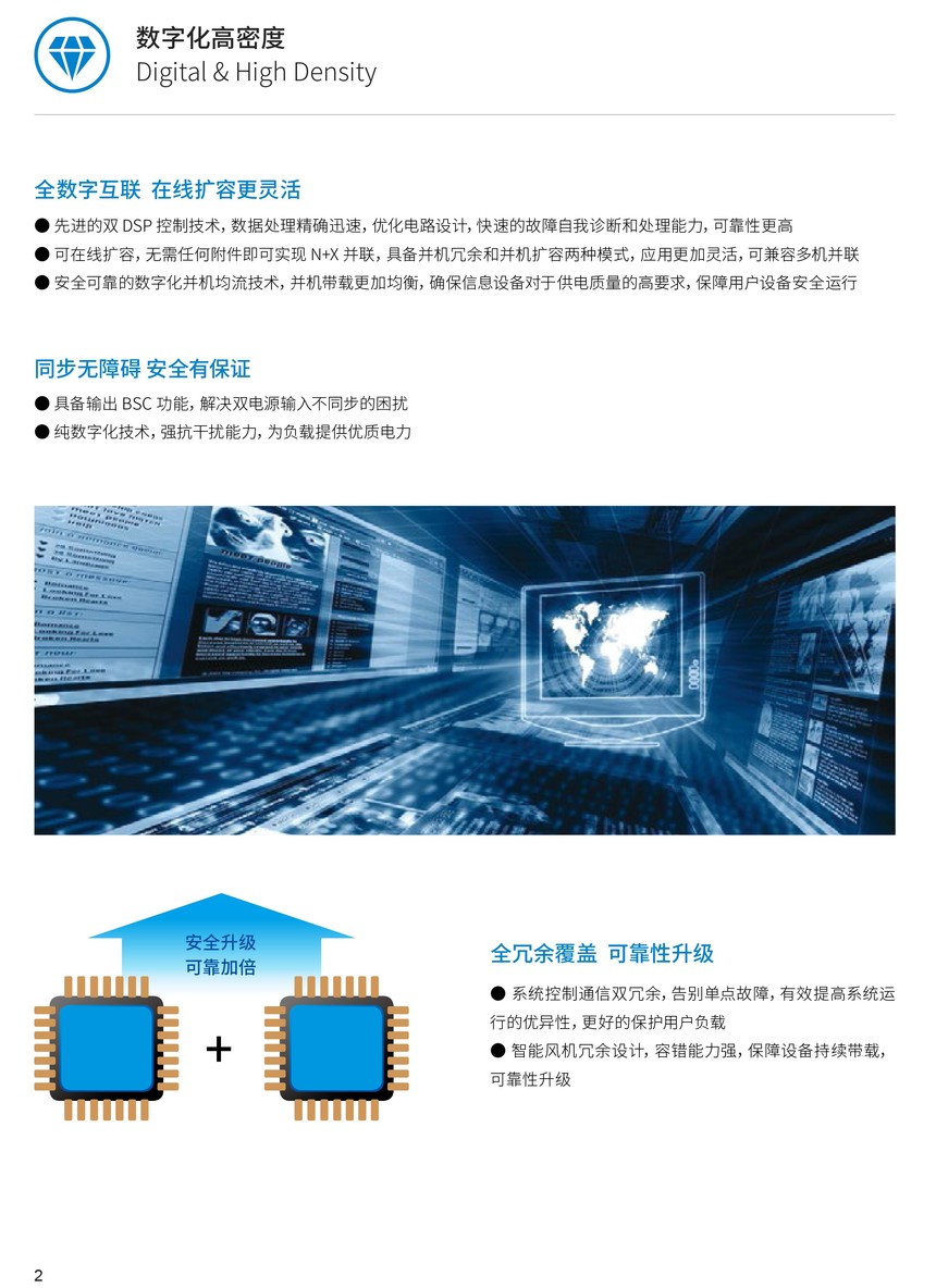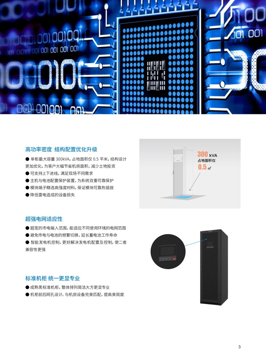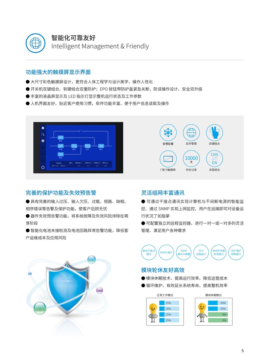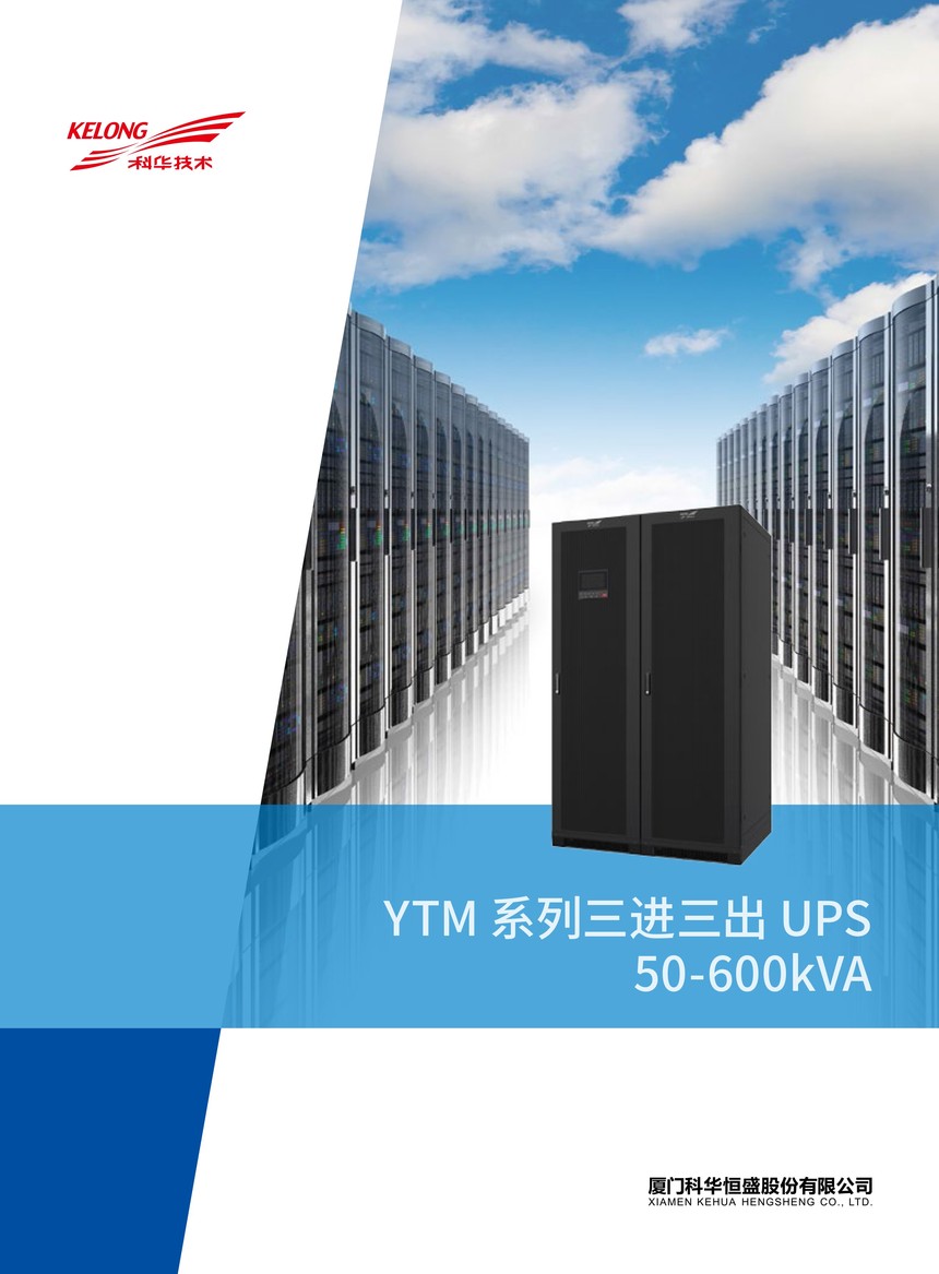 概述 科华UPS电源KELONG®YTM系列模块化三进三出 UPS,采用先进的三电平逆变技术,从整机到部件的冗余设计更加完善可靠,数字化技术全互联,具有高效率、高功率密度、易于扩展、按需扩容和占地面积小等优点,为负载提供安全、稳定、纯净的绿色电源。 功能特点 数字化高密度Digital & High Density●全数字互联 在线扩容更灵活 ●全冗余覆盖 可靠性升级●高功率密度 结构配置优化升级 ●超强电网适应性 ●标准机柜 统一更显专业 节能化绿色高效Efficient & Saving●优异指标效率提升 ●国家认证绿色环保 智能化可靠友好Intelligent Management&Friendly●功能强大的触摸屏显示界面●灵活组网丰富通讯●模块轮休友好高效●更安全的智能化电池管理 ●贴心设计 变频器功能 便捷化卓越运维Convenient & Easy Maintenance●模块化设计按需扩容快捷建设●强大的电池调节能力 ●自主专利智能蓄电池监测系统