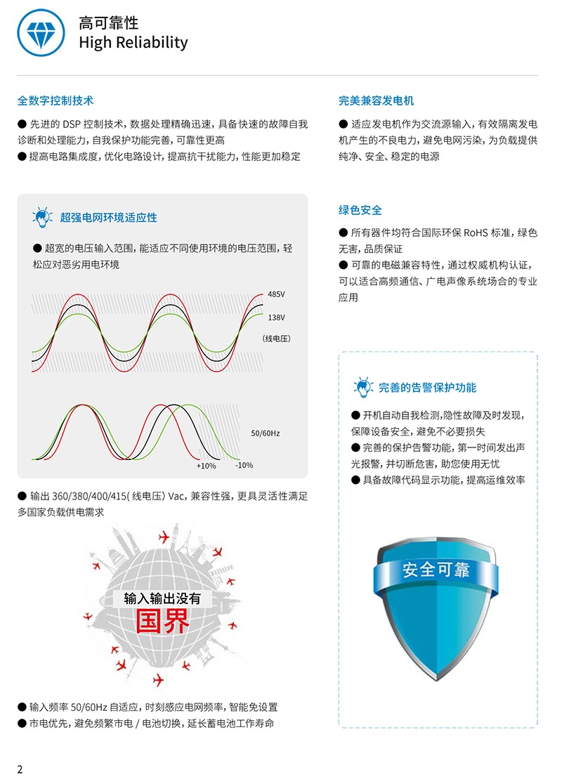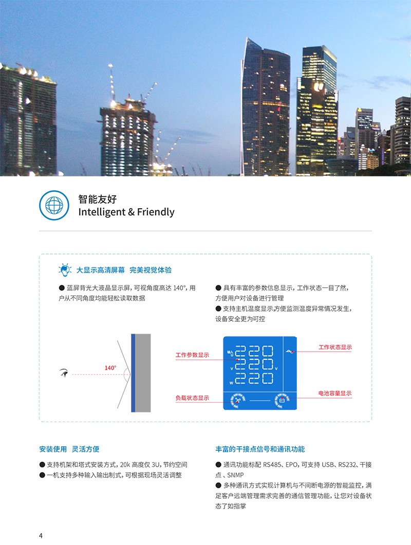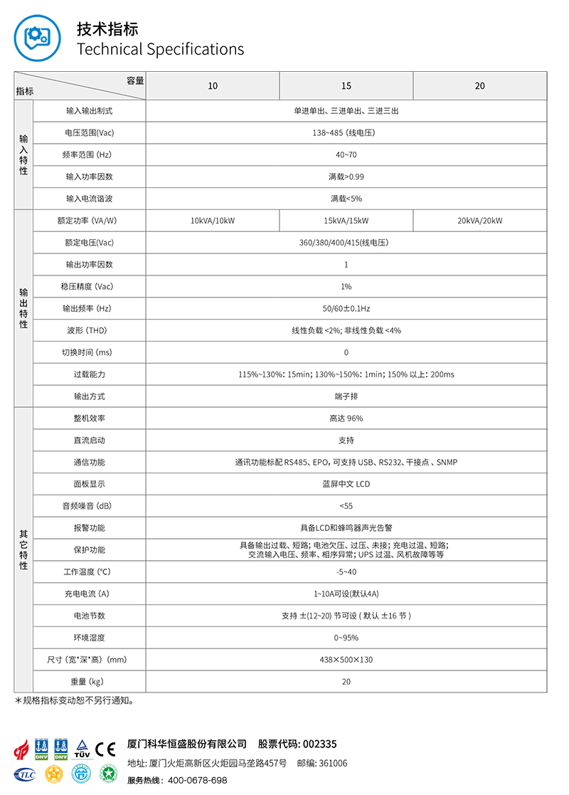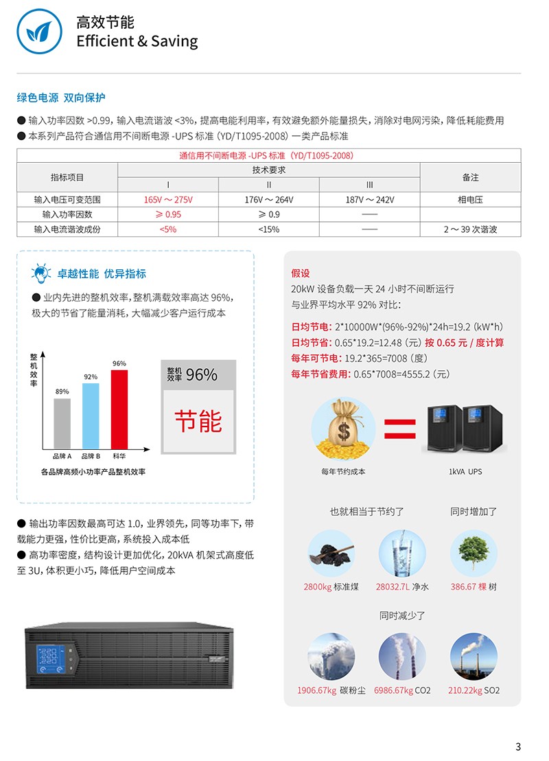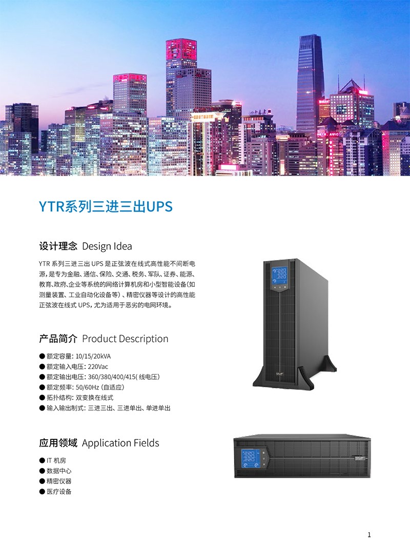 概述 科华UPS电源YTR系列三进三出UPS,是正弦波在线式高性能不间断电源,是专为金融、通信、保险、交通、税务、军队、证券、能源、教育、政府、企业等系统的网络计算机房和小型智能设备(如测量装置、工业自动化设备等)、精密仪器等设计的高性能正弦波在线式UPS,可立可卧,尤为适用于恶劣的电网环境。 功能特点 ●智能控制,安全运行采用全数字化DSP控制技术,控制精度高、运行速度快,提高可靠性和稳定性 完善的网络监控方案,实现UPS运行维护的智能简化管理,提高系统的可靠性 可靠的电磁兼容特性,通过权威机构认证,可以适合高频通信、广电声像系统场合的专业应用 输入过压、输入欠压、过载、短路、缺相等告警及保护功能,适应性强、抗负载能力高 超宽的输入电压范围,完全满足恶劣的电网环境 MMBM电池管理,有效延长电池的使用寿命,减少电池的维护 先进的恒压充电、恒流充电、二阶段充电等充电方式,有效提高电池充电效能 ●节能高效,绿色环保输入功率因数>0.99,输入电流谐波<3%,提高电能利用率,有效避免额外能量损失,消除对电网污染,降低耗能费用 本系列产品符合通信用不间断电源-UPS 标准(YD/T1095-2008)一类产品标准 业内先进的整机效率,整机满载效率高达96%,极大的节省了能量消耗,大幅减少客户运行成本 输出功率因数最高可达1.0,业界领先,同等功率下,带载能力更强,性价比更高,系统投入成本低 高功率密度,结构设计更加优化,20kVA 机架式高度低至3U,体积更小巧,降低用户空间成本 所有器件均符合国际环保RoHS 标准,绿色无害,品质保证 完美兼容发电机,适应发电机作为交流源输入,有效隔离发电机产生的不良电力,避免电网污染,为负载提供纯净、安全、稳定的电源 ●维护简单,交互友好蓝屏背光大液晶显示屏,可视角度高达140°,用户从不同角度均能轻松读取数据 一机支持多种输入输出制式,可根据现场灵活调整 通讯功能标配 RS485、EPO,可支持 USB、RS232、干接点 、SNMP 多种通讯方式实现计算机与不间断电源的智能监控,满足客户远端管理需求完善的通信管理功能,让您对设备状态了如指掌 开机自动自我检测,隐性故障及时发现,保障设备安全,避免不必要损失 完善的保护告警功能,第一时间发出声光报警,并切断危害,显示故障代码,提高运维效率