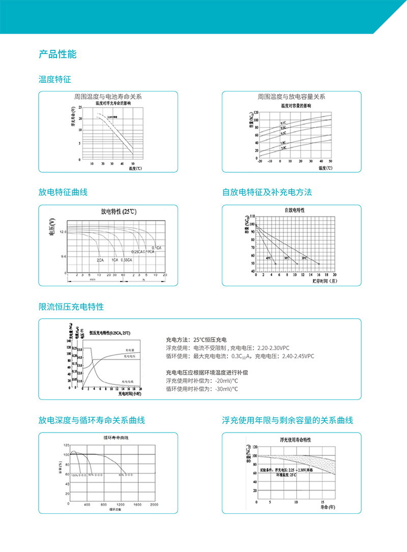 概述 ● UPS不间断电源系统 ● *设备 ● 备用电力电源 ● 紧急照明系统 ● 计算机备用电源 ● 电力系统 功能特点 产品性能特点: ● 免维护,使用过程无需补充水 ● 使用寿命可达6 年 ● 内阻小 ● 完全密封,不渗漏液体,无酸性气体溢出 ● 自放电小 特性: ● 吸附式玻璃纤维隔板技术,气体复合效率达到99%,无需加水维护。 ● 空运不受限制,符合航空运输IATA/ICAO 标准*别条款A67. ● 浮充和循环使用寿命长 ● 可提供标准和阻燃ABS 槽盖 ● 低自放电:20℃时每月容量平均下降3% ● 温度使用范围(放电:-15 ~ 50℃ / 充电:0 ~ 40℃ / 贮存:5 ~ 40℃)